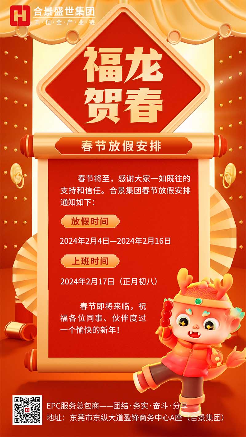 龍年行大運(yùn),喜迎新篇章。2024年新春佳節(jié)將至,根據(jù)國(guó)家節(jié)假日放假規(guī)定,結(jié)合我司實(shí)際情況,決定2024年春節(jié)放假安排如下:
