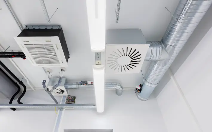許多項目都傾向于選擇第三種方式。但需要注意的是,這種布局方式會減少下方上技術(shù)夾層(靜壓箱)的高度。為了確保空氣流動的穩(wěn)定性和日后的FFU日常維護(hù),必須保持一定的凈高。根據(jù)合潔科技電子潔凈工程師的建議,最小的凈高應(yīng)為1.5米。
